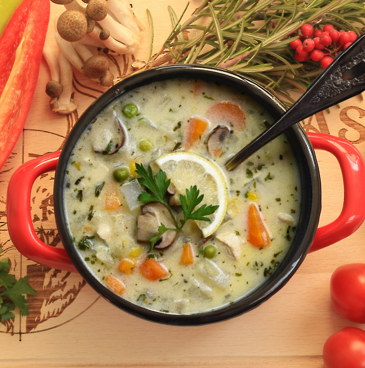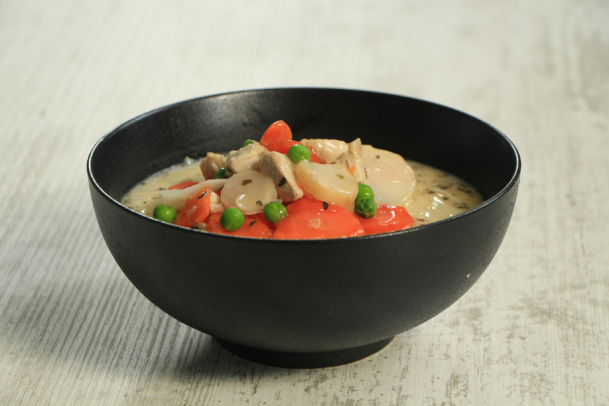 Összetevők: Ivóvíz, csirkemell, tejföl, fehérrépa - sárgarépa - borsó mix, vöröshagyma, BL 55 liszt, margarin (növényi olajok ((pálmaolaj, repceolaj, napraforgóolaj, változó arányban)), víz, napraforgó lecitin, zsírsavak mono- és digliceridjei, tejsavópor, só, citromsav, kálium-szorbát, aroma, A vitamin, D vitamin, karotinok), étkezési só, citromlé (víz, citromsav, aromák, kálium-szorbát, karboxi-metil-cellulóz, gumiarábikum, fagyanta glicerinészterei, karotinok, aszkorbinsav, kálium-metabiszulfit, zsírsavak mono- és digliceridjei), morzsolt bazsalikom, szárított metélőhagyma, őrölt fehérbors.