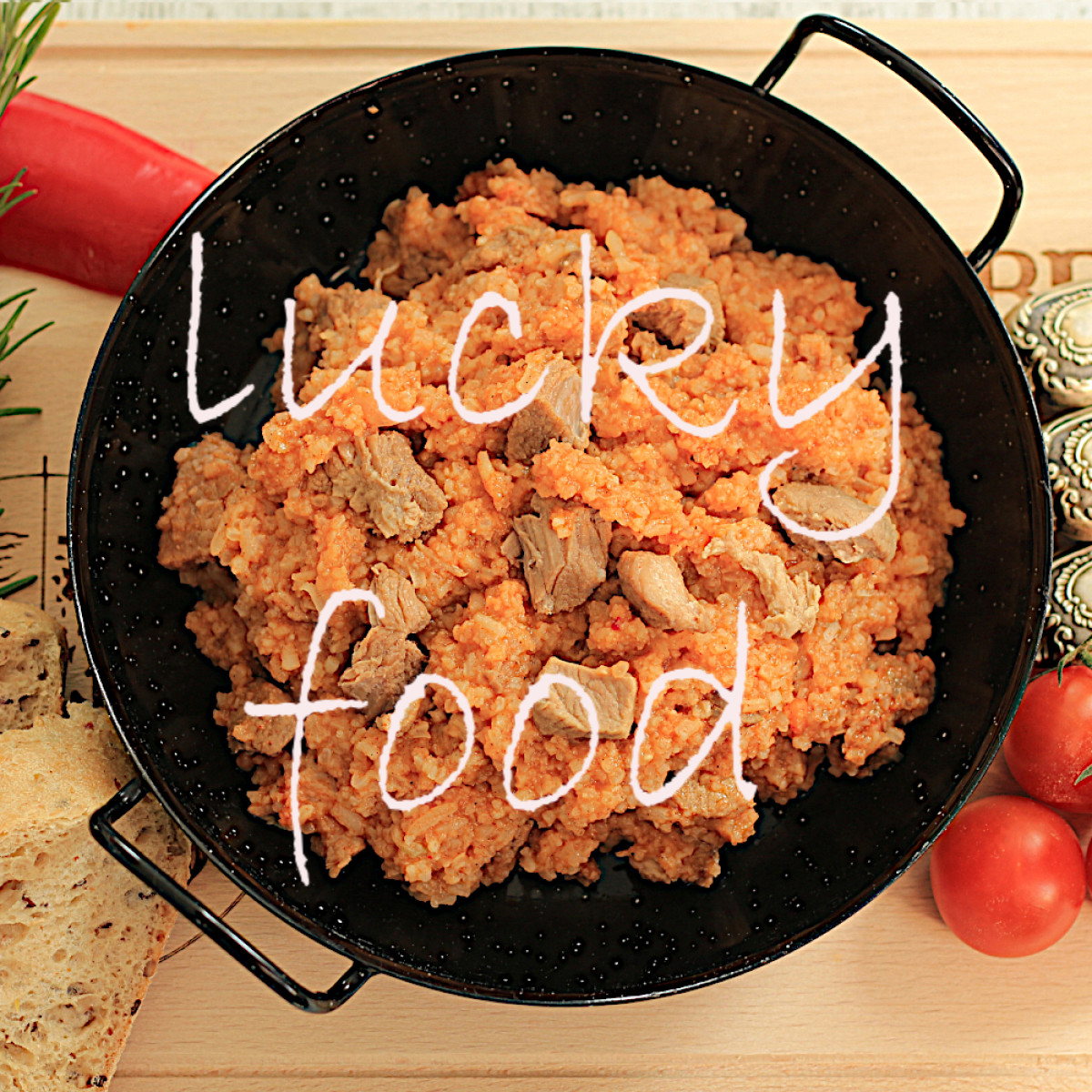 Összetevők: Sertéslapocka, ivóvíz, rizs, vöröshagyma, natúr lecsó (ivóvíz, paprika, sűrített paradicsom, cukor, só, antioxidáns: citromsav), étolaj, só, fűszerpaprika, fokhagyma granulátum, őrölt kömény, őrölt feketebors.